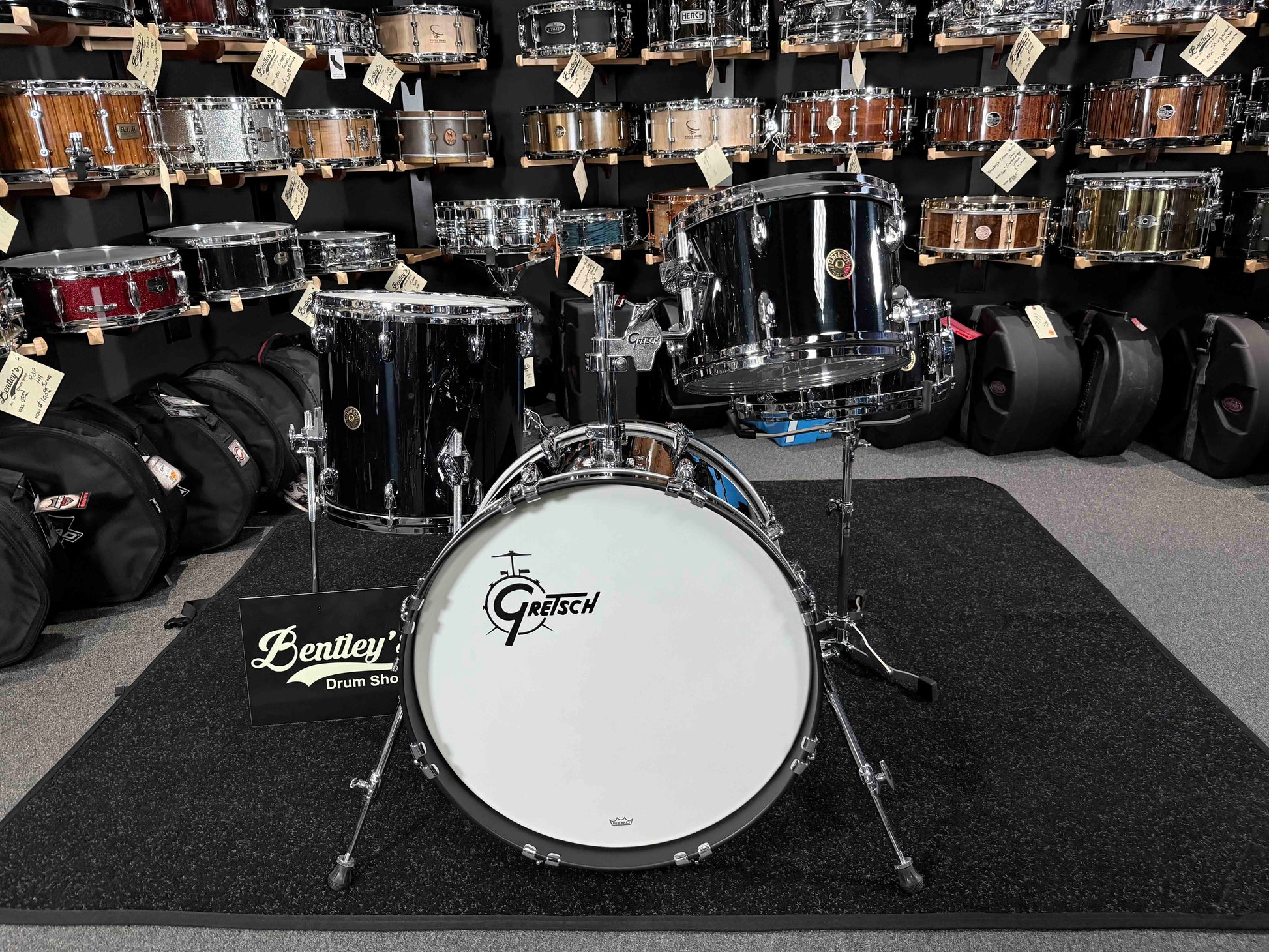 Check Out this Classy, Brand-New Gretsch USA Custom 4-Piece 12/14/20 Drum Kit Set in Solid Black Nitron with a Matching 5.5x14 Snare Drum!