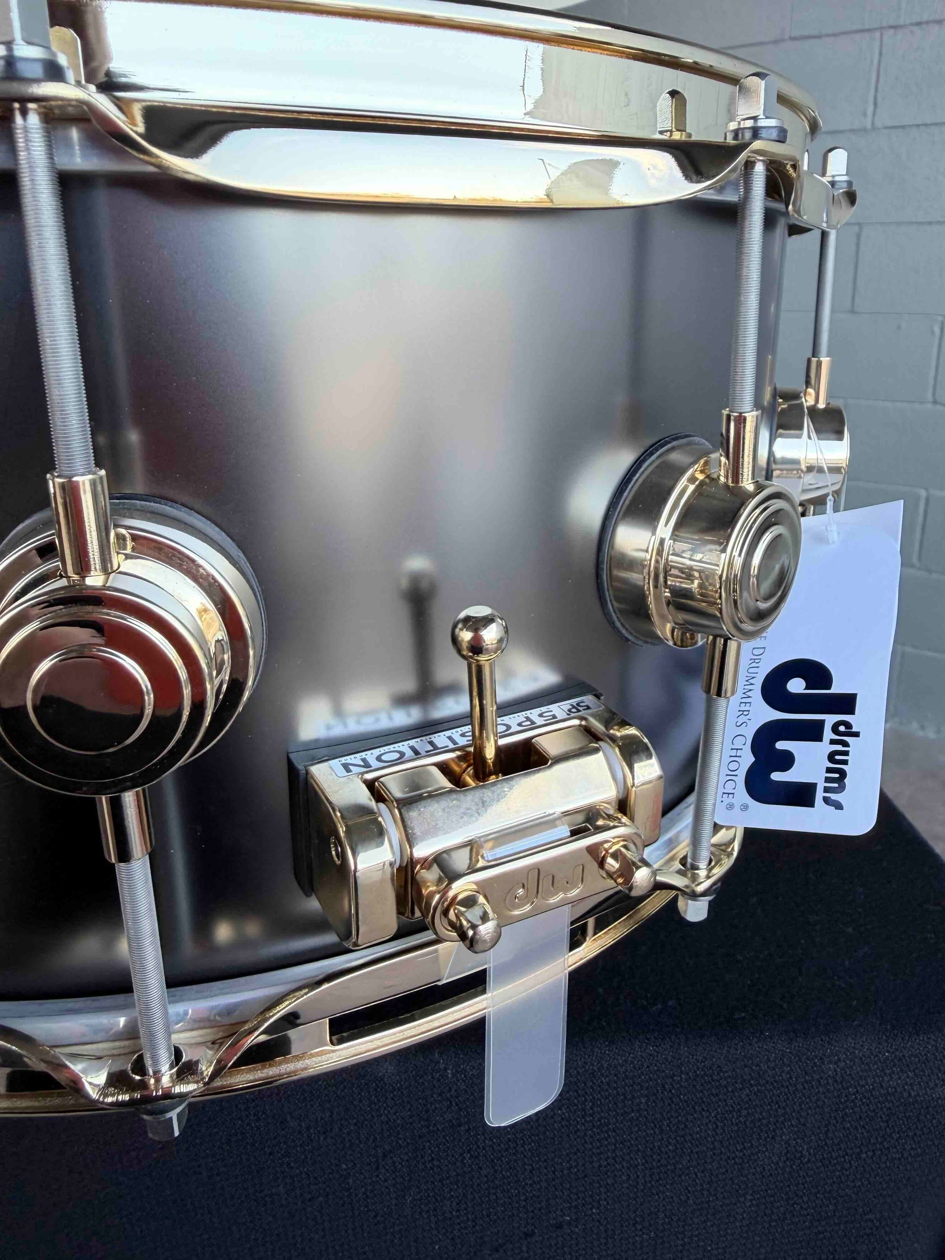 Découvrez cette incroyable caisse claire DW 6,5x14" en nickel noir satiné sur laiton de 1 mm avec matériel doré !