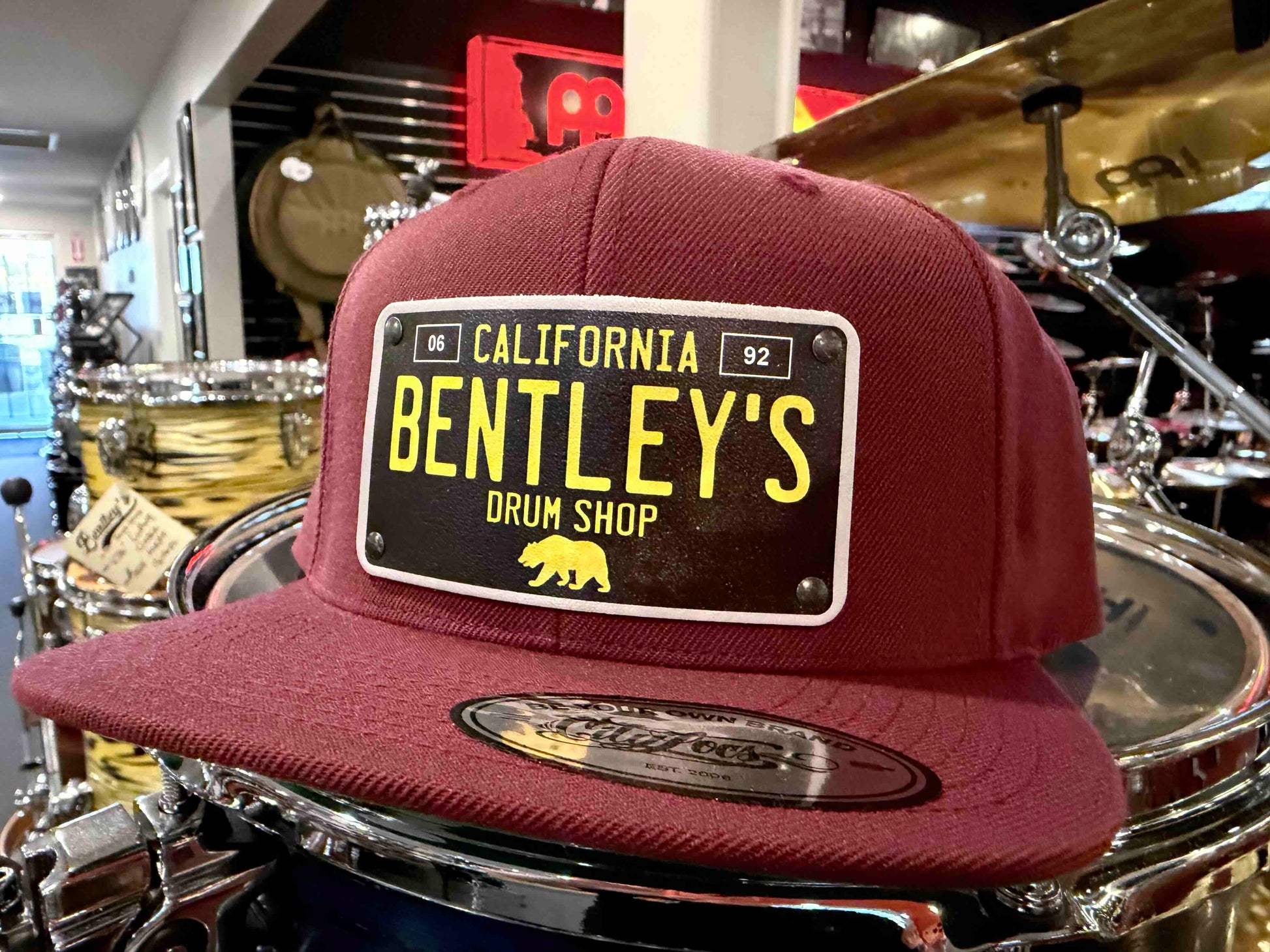 Custom Bentley's Drum Shop license plate badge hats with adjustable snapback and breathable cloth!