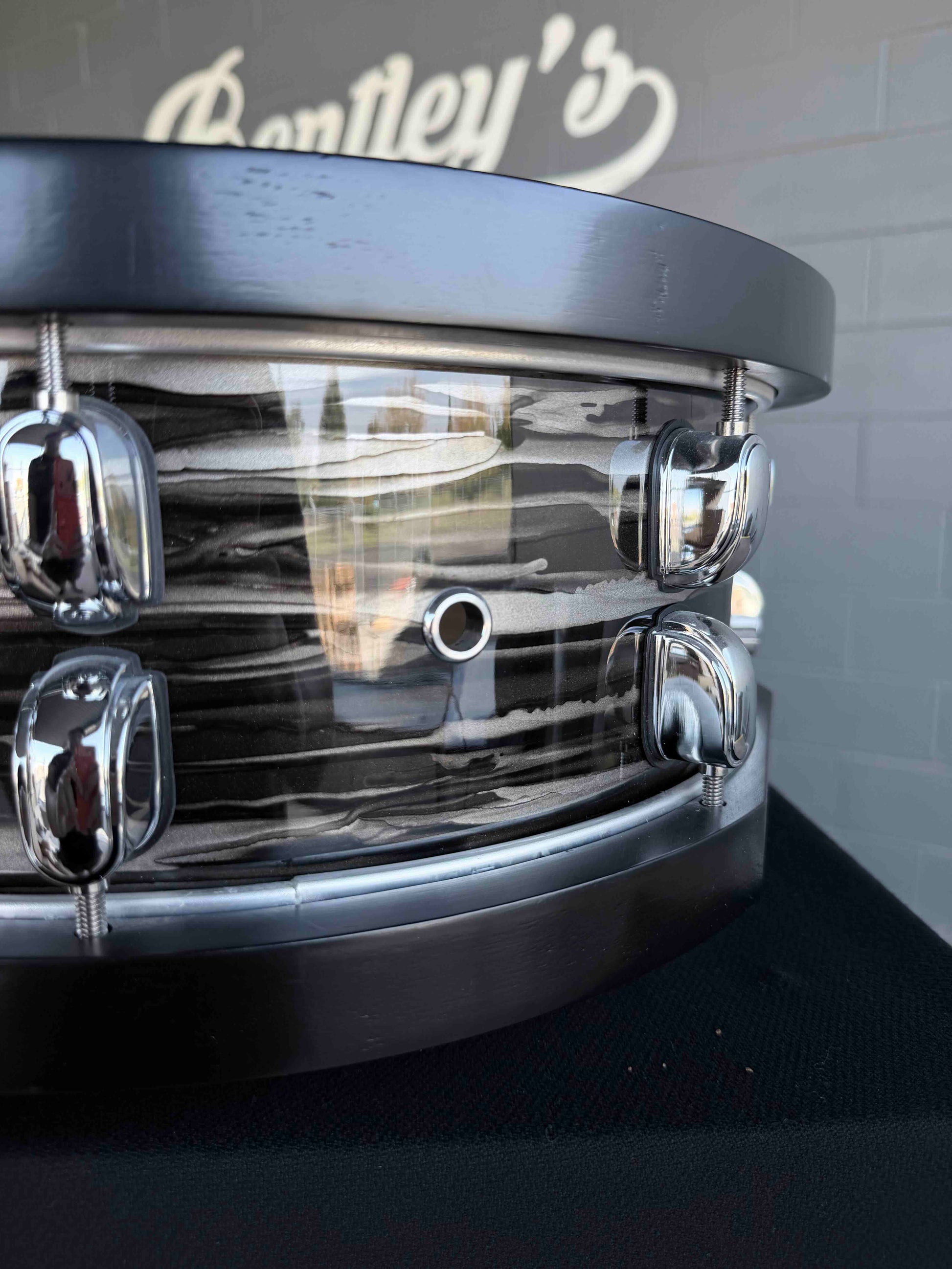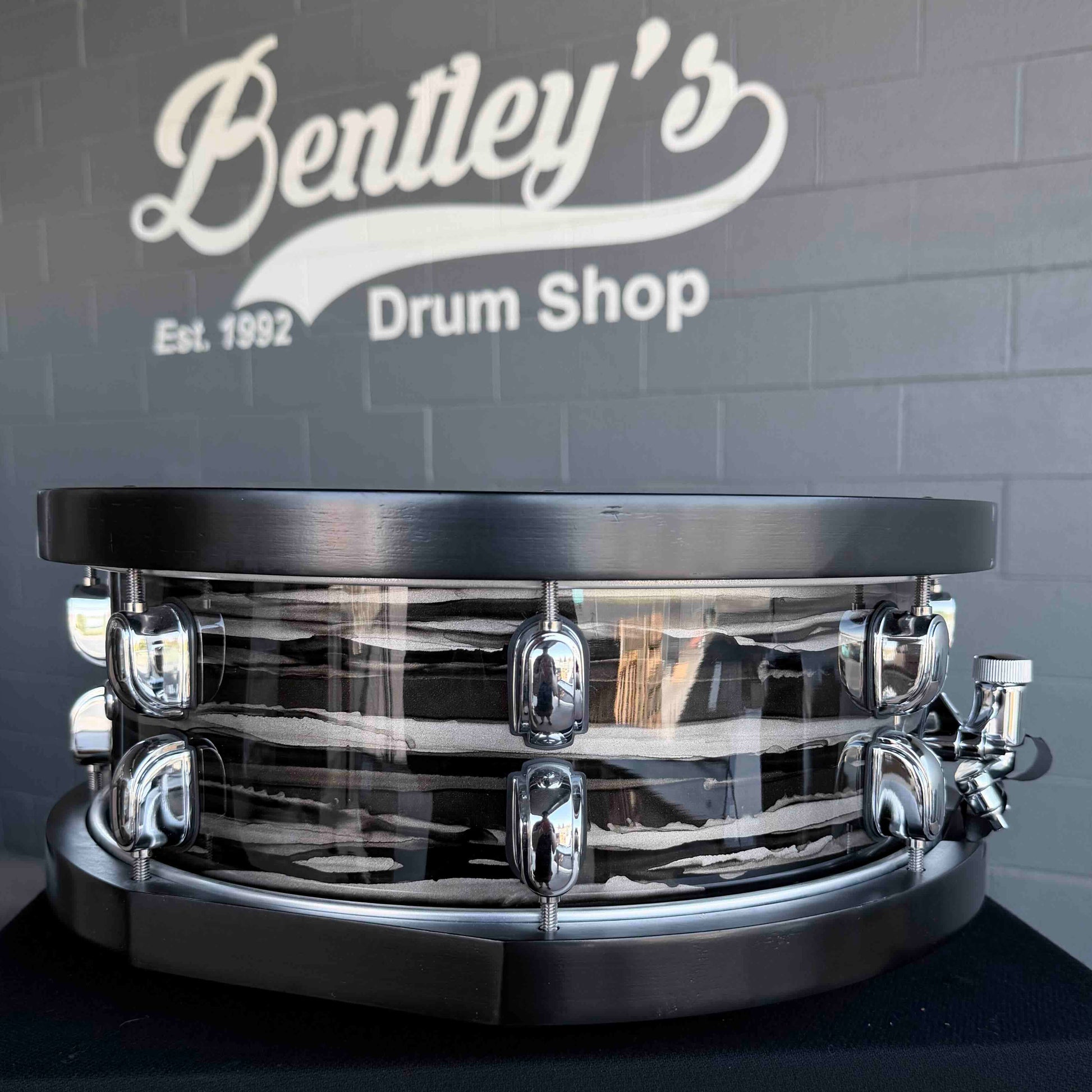 The shallower depth gives this drum a quicker, sharper attack than the 6.5" version, while retaining warmth thanks to the same 6-ply, 5 mm 100% maple shell construction. This drum swaps out the natural Sienna finish from the standard model and replaces it with a lacquered Charcoal Oyster pattern, and most noticeably, the 100% maple hoops are finished in a deep matte black color that contrasts beautifully with a white batter head. The hoops are coated with urethane for durability.
