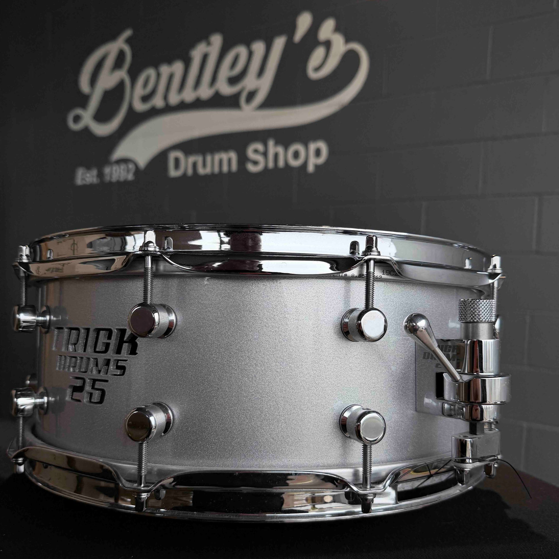 Only 50 of these drums were made to celebrate Trick's 25th Anniversary! Trick created this tasty 3.1 mm thick Aluminum snare drum. This has all of the fixings. The understated machined lugs, the smooth and dependable Trick GS007 throw-off and the clean Alien Silver finish. Super classy.